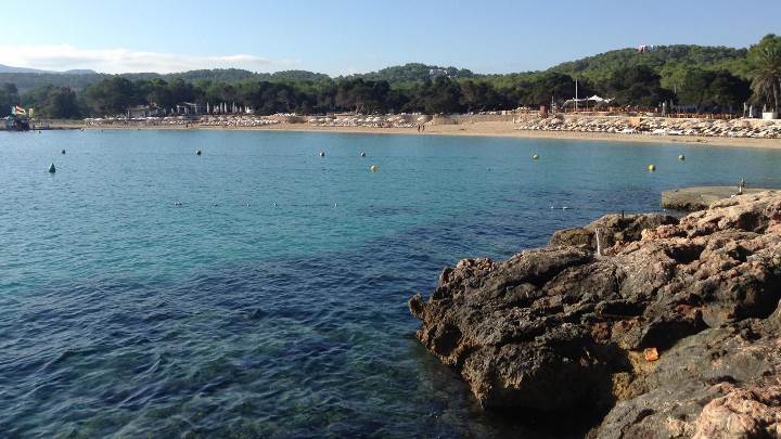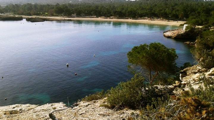 A curved and sandy beach with rocks on both sides, a pinegrove that surrounds the beach and views of San Antonio and a promontory known as Cap Nono. The not very deep, calm and transparent waters make it ideal for families with children. Also you can practise aquatic sports.