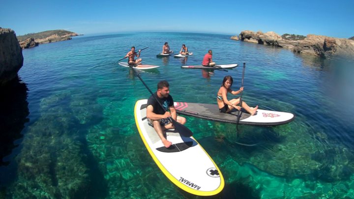 Stand Up Paddle: Join them and enjoy a beautiful Stand Up Paddle Surf trip in Ibiza. You will have an unforgettable experience browsing the best clear waters. You will discover hidden inaccesible beaches and going deep into maritime caves. Sunny mornings or amazing sunsets, anytime is perfect for your trip. You can go alone or with your couple, celebrate your honey moon, your stag party or enjoy this experience with your friends or colleagues.