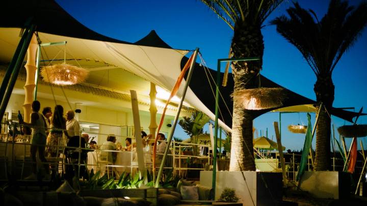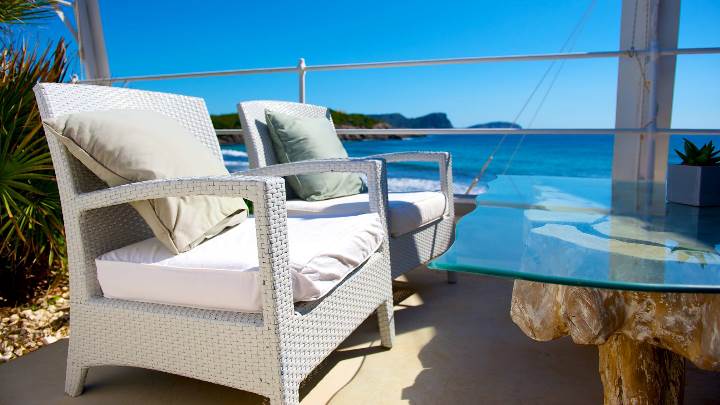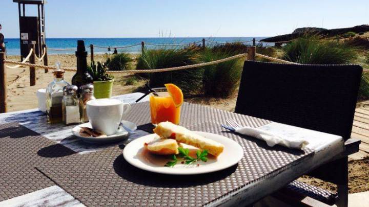 crystalline sea of Cala Nova beach with views of Tagomago. At the table,