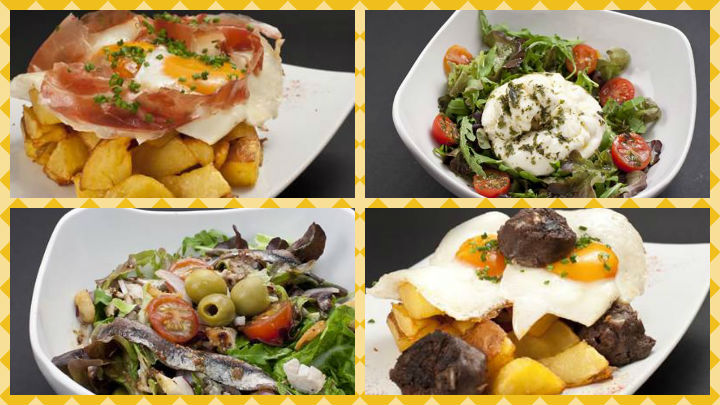 Jamón ibérico, huevo poché, queso manchego, compota de tomate y lechuga