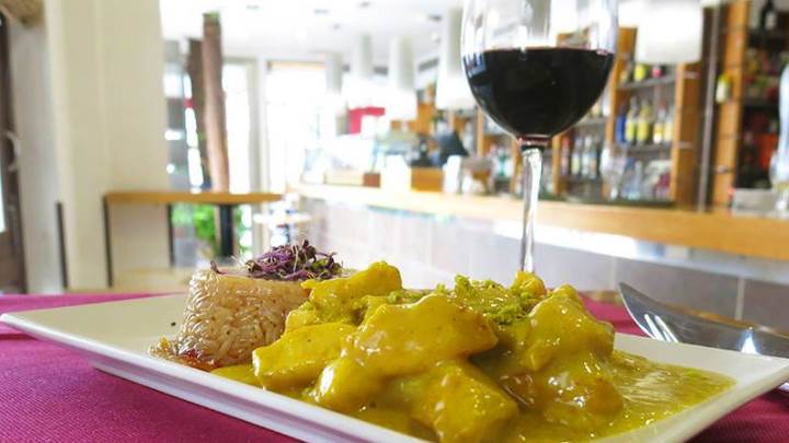 Curry de pollo con mango y pistachos acompañado de arroz basmati y verduras salteadas.....11,50